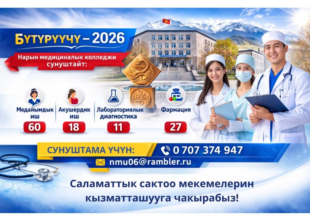 Нарын медициналык колледжинде медициналык кароо өттү Бүгүн биздин колледжде студенттер үчүн пландык медициналык кароо жүргүзүлдү. Иш-чаранын максаты — жаштардын ден...